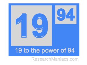 To find the answer, you multiply 19 by itself 94 times as follows:
