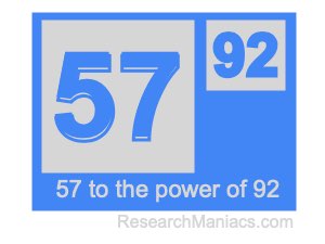Note that 57 to the power of 92 is the same as 57 raised to 92. In xy, 57 is the base (x) and 92 is the exponent (y). Therefore, you can also write the problem and the answer as follows:
