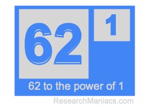 Here we will show you the answer to 62 to the power of 1 (sixty-two to the power of one) and explain how we got the answer.